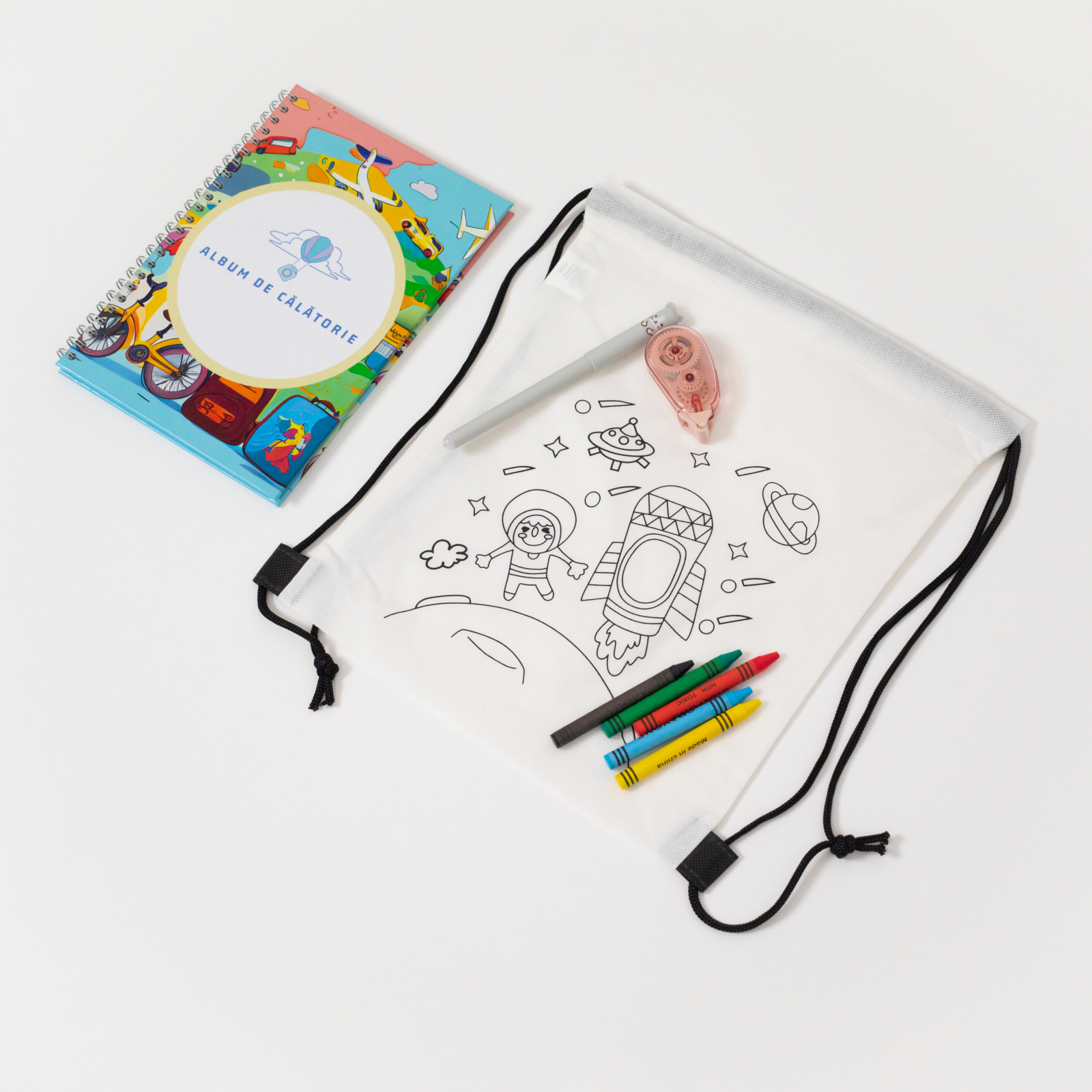 Setul este format dintr-un Rucsac textil de colorat pentru copii cu culori, Pix animal roller gel cu ștergere, Bandă dublu adezivă și un Album de călătorie.
